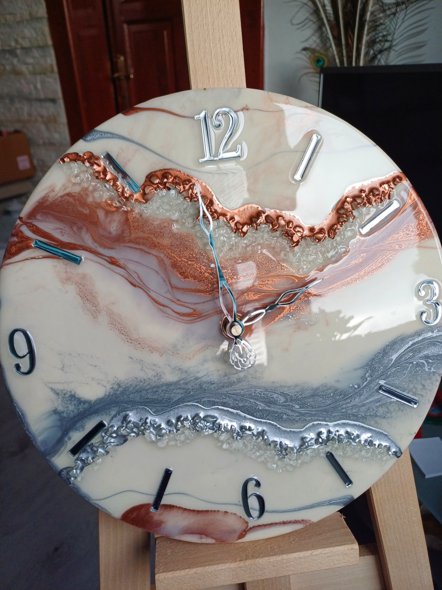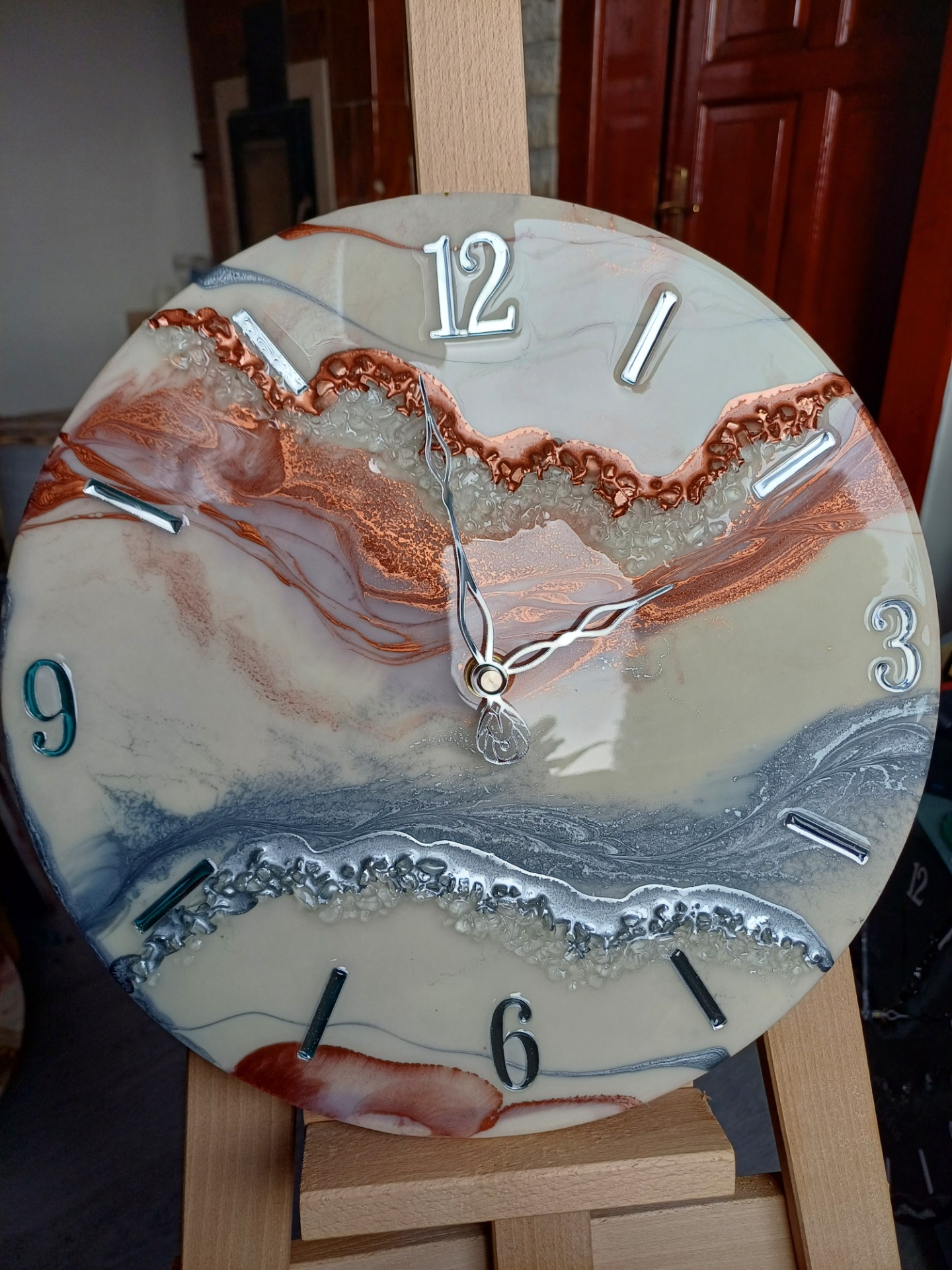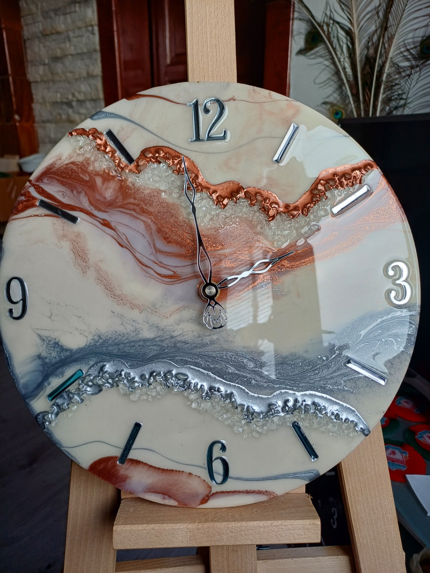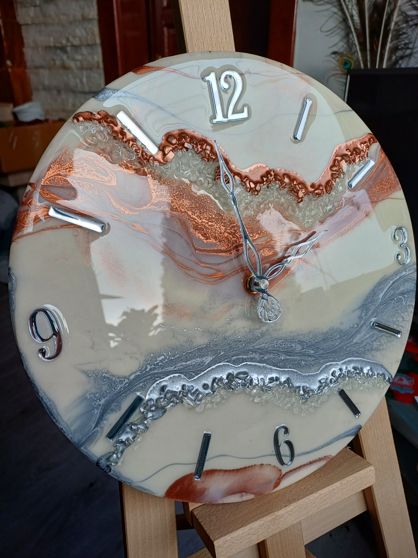 Krásne ručne vyrábané hodiny v priemere 40cm s dvomi pásmi kamienkov
